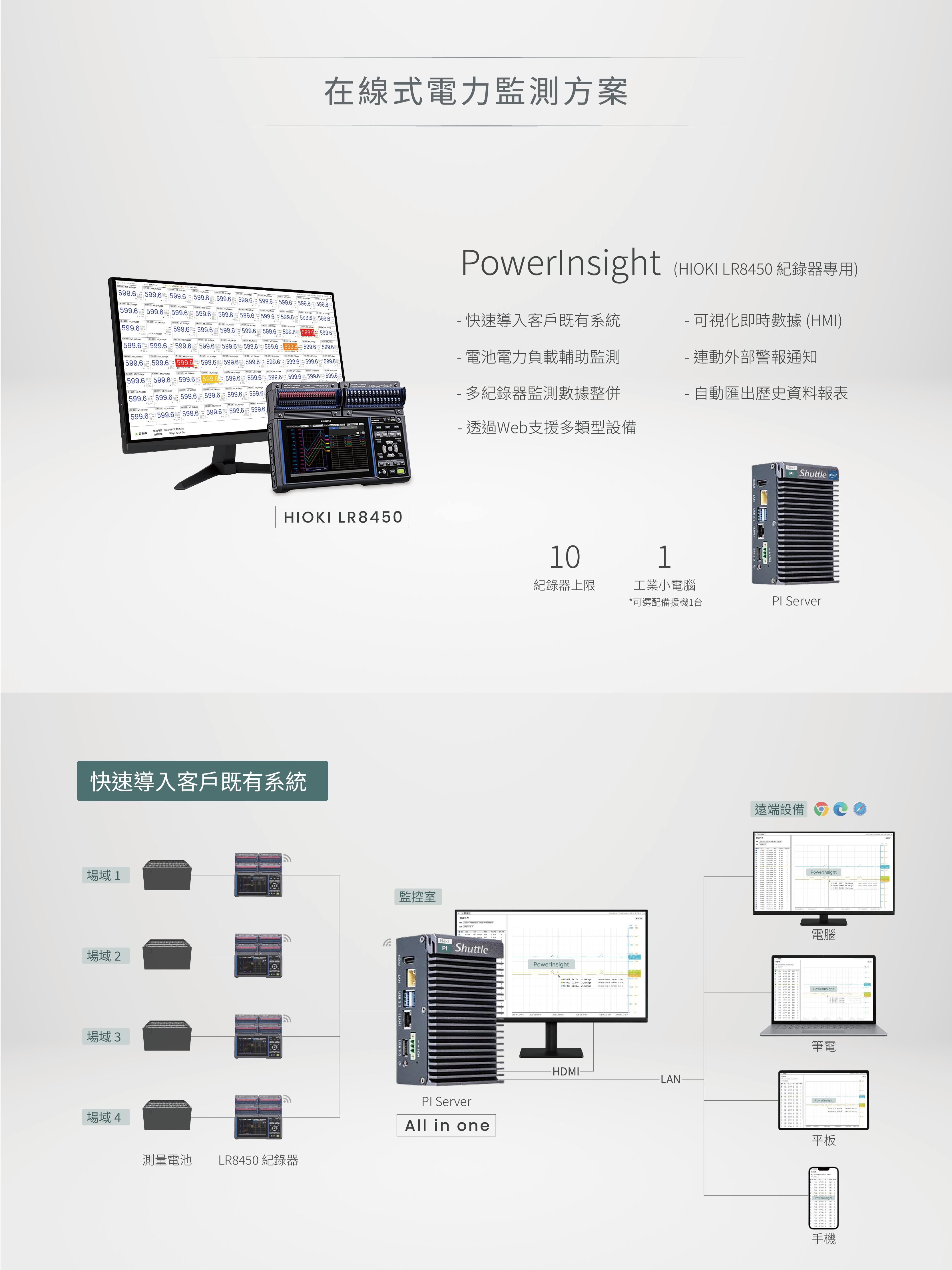 - PowerInsight 多電池負載監測系統,整合多台 Hioki LR8450 紀錄器,透過Web系統遠端監測。