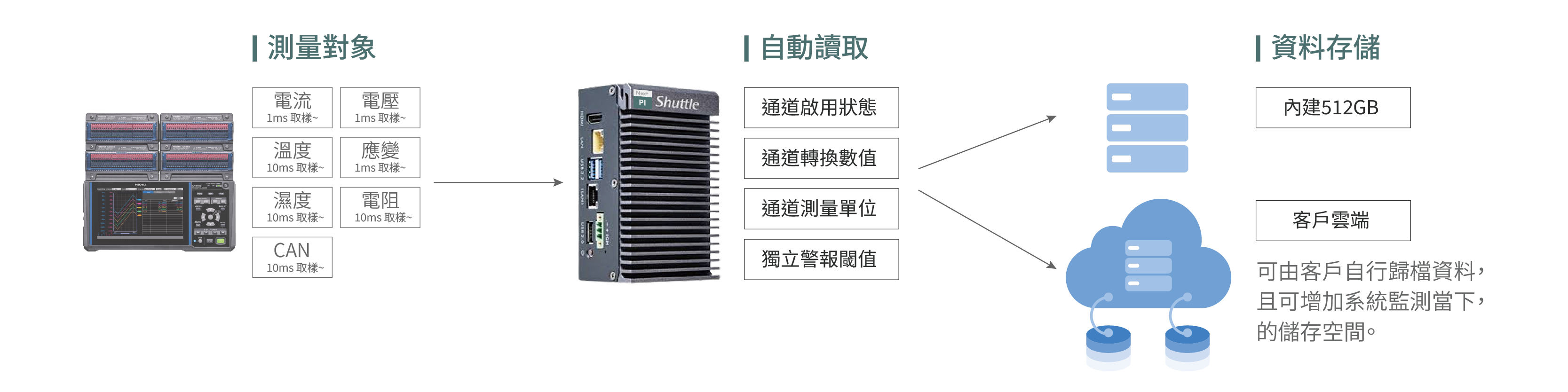 - 自動讀取LR8450設定值及轉換後的測量數值,以循環方式儲存於內建512GB儲存空間。