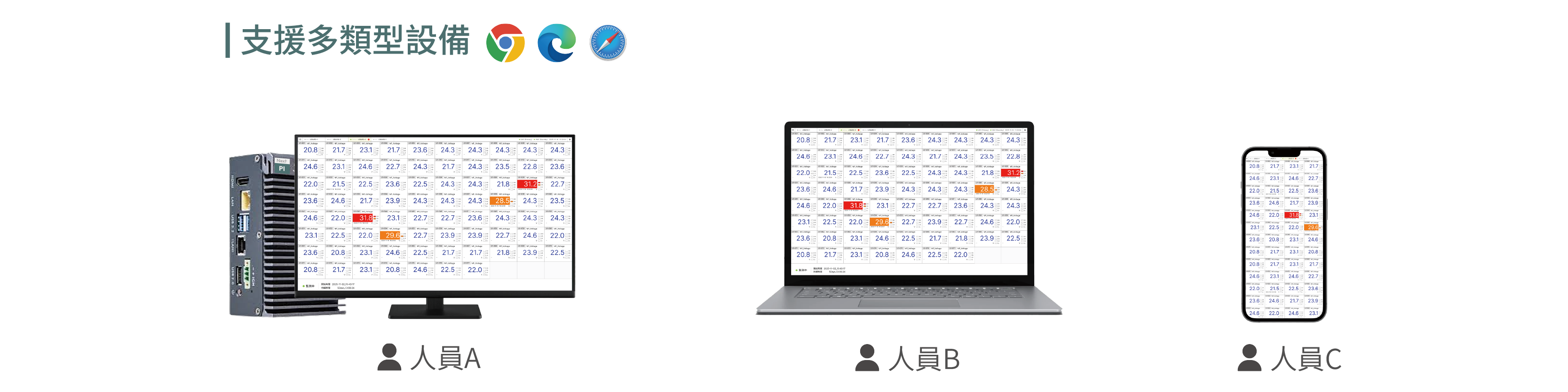 - 可透過多種主流瀏覽器存取,即時檢視監測資訊、歷史分析資料及系統設定。