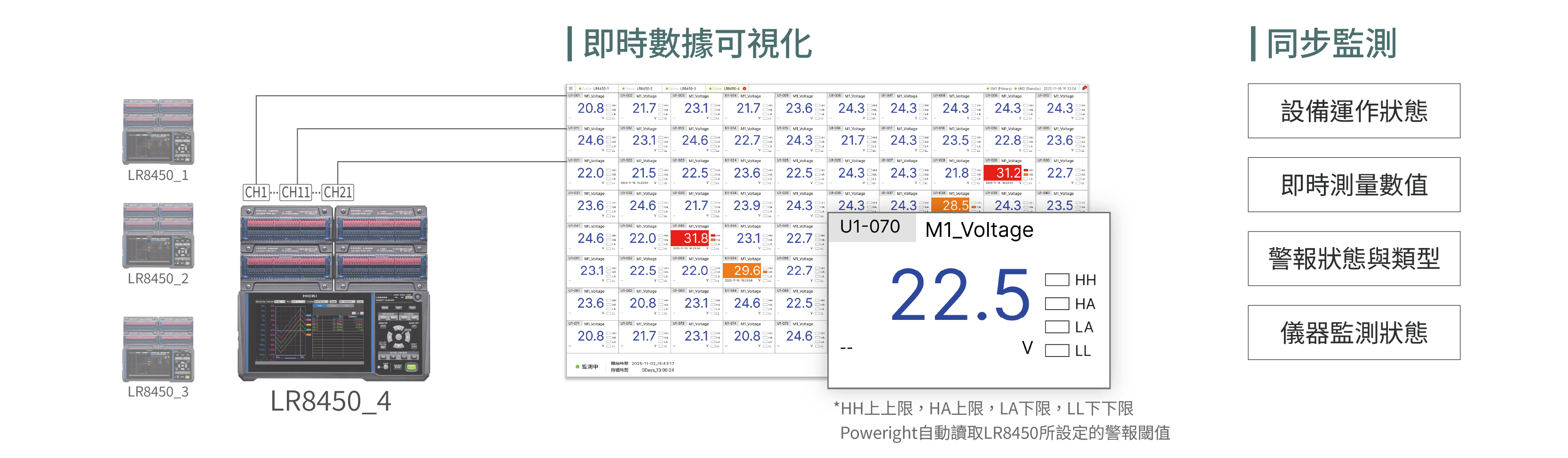 - 系統可自動偵測儀器與各通道運行狀態,並與測量現場保持同步,即時更新多通道之當前監測數值。