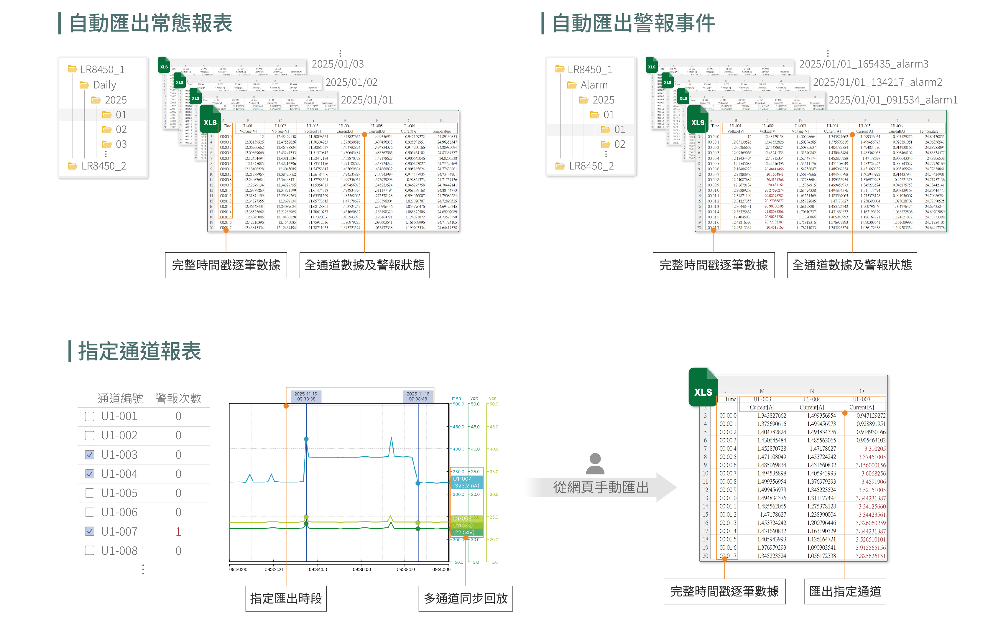 - 客戶可依需求手動匯出指定時間區間與指定通道的報表。