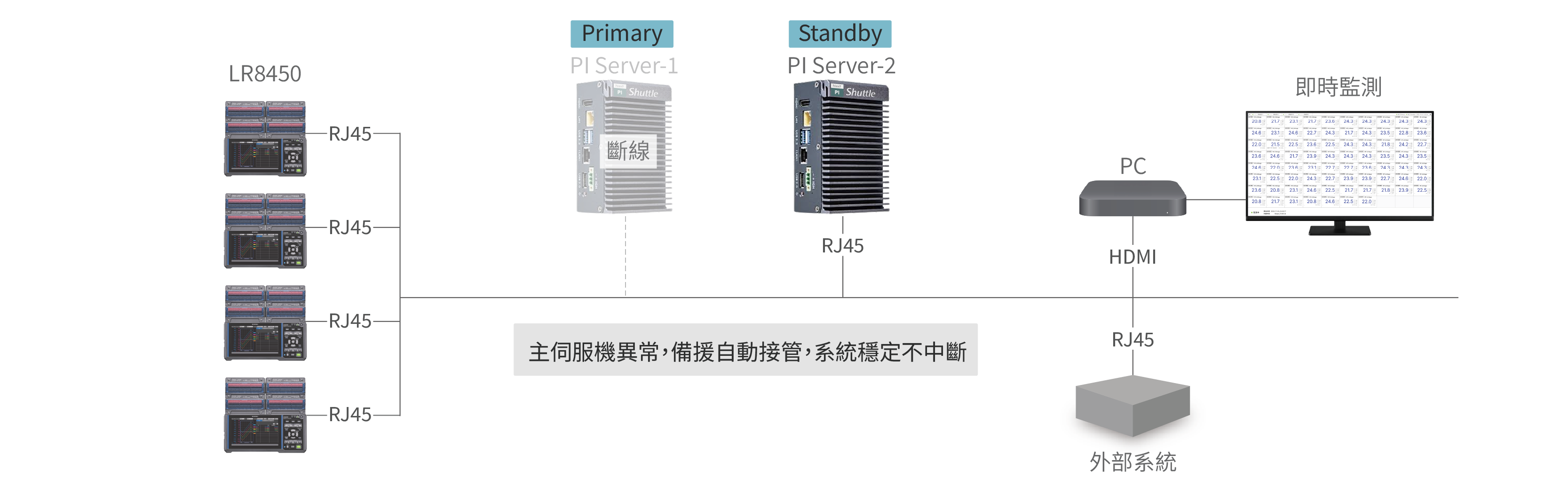 - 當主要主機發生異常或停止運作時,系統將自動切換至備援主機持續進行監測,確保監測資料不中斷,避免資料遺失。